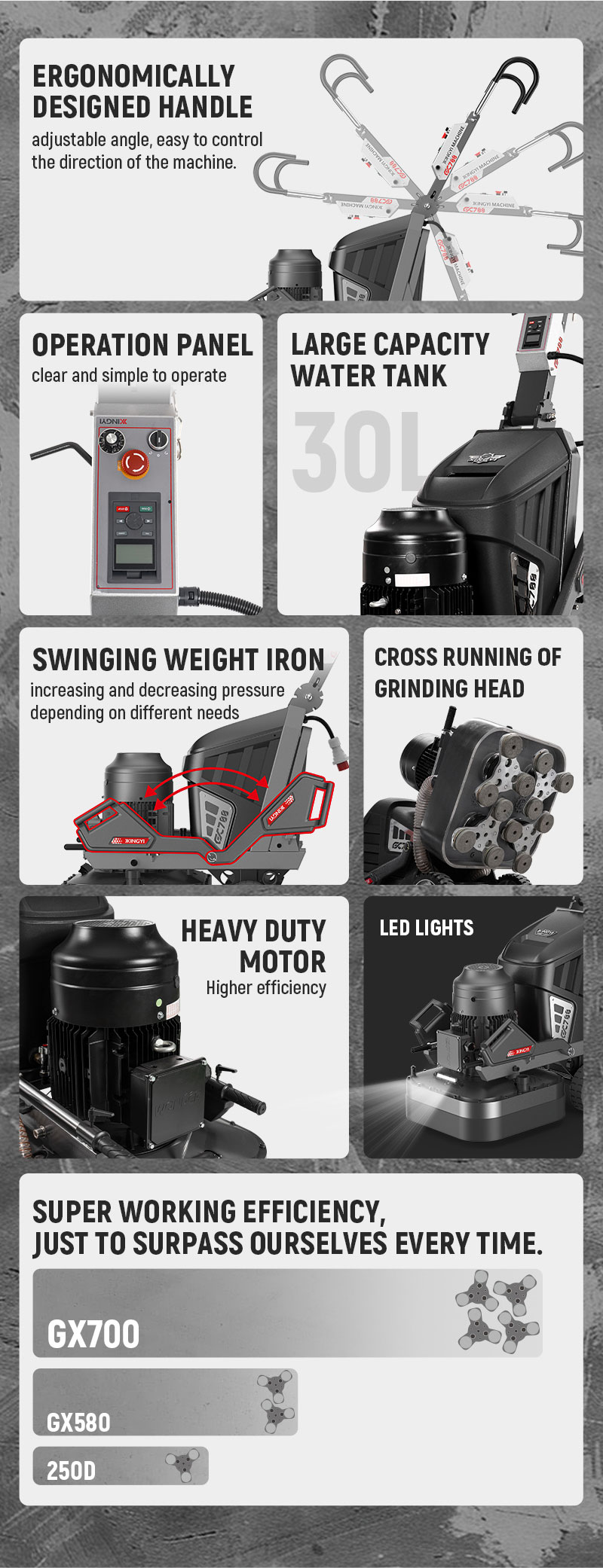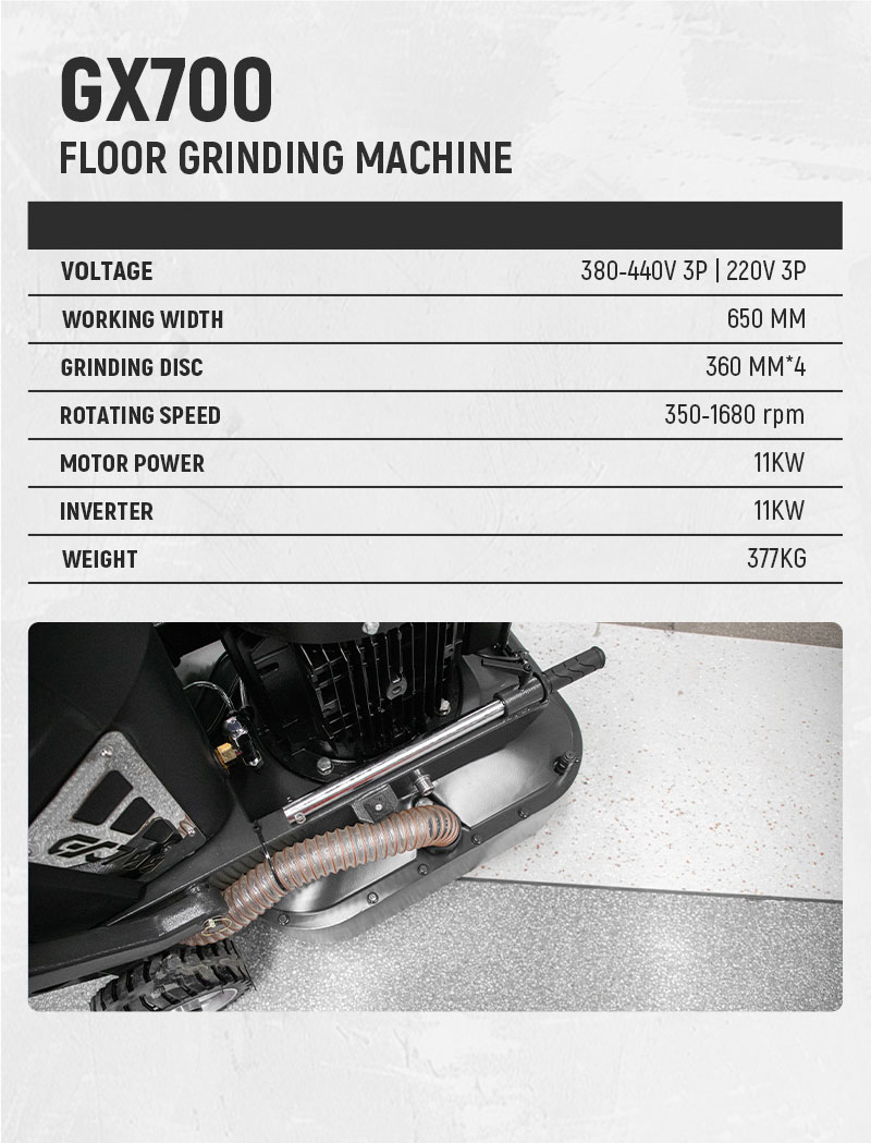 Engineered for commercial and industrial flooring projects, the GX700 excels in concrete polishing, epoxy removal, and surface preparation. Its optimized weight-to-power ratio ensures extended operation with minimal downtime, making it a cost-effective solution for contractors prioritizing productivity and equipment longevity.