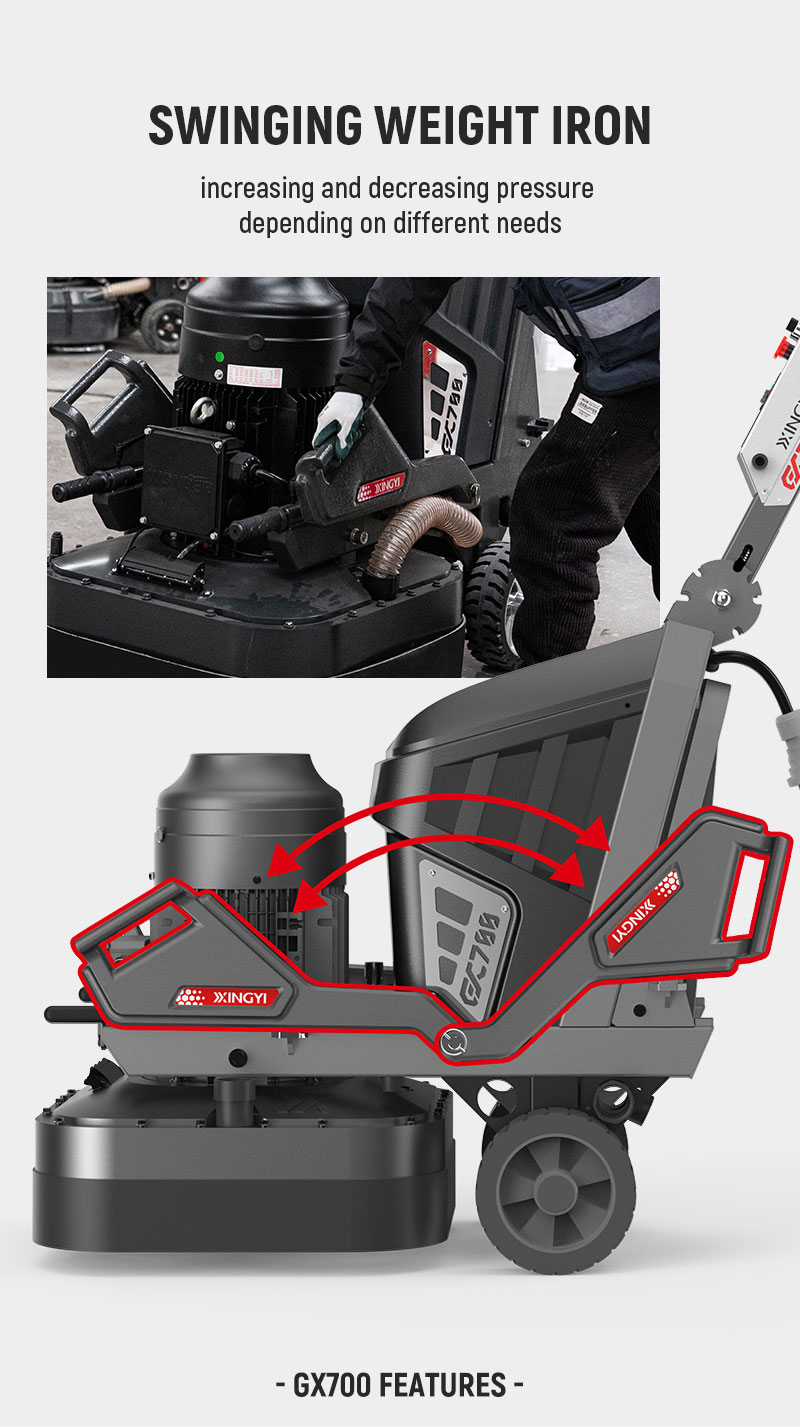 The GX700 Concrete Grinder, the latest innovation from XINGYI Machine, is a square-head 4-disc grinding powerhouse designed for ultimate performance and reliability. As an upgraded successor to the market-proven GX650 (with over a decade of industry validation), this machine features an integrated gearbox and chassis design that delivers exceptional efficiency and ultra-low failure rates.
