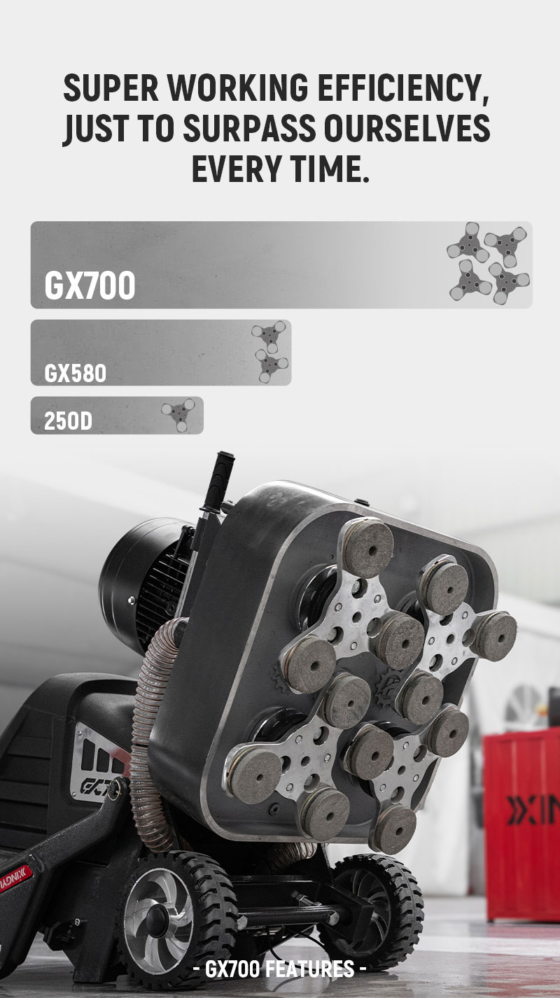Engineered for commercial and industrial flooring projects, the GX700 excels in concrete polishing, epoxy removal, and surface preparation. Its optimized weight-to-power ratio ensures extended operation with minimal downtime, making it a cost-effective solution for contractors prioritizing productivity and equipment longevity.