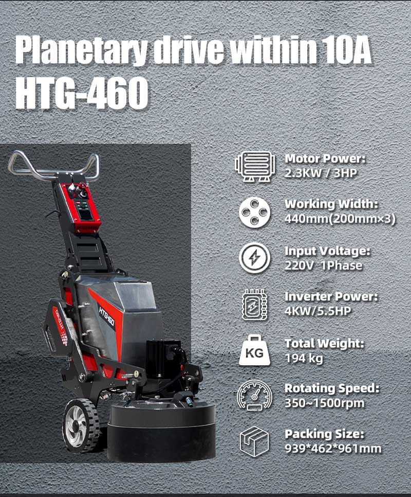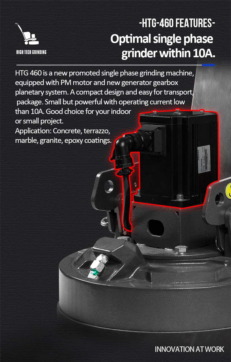 HTG 460 is a new promoted single phase grinding machine, equipped with PM motor and new generator gearbox planetary system. A compacted design and easy for transport, package. Small but powerful with operating current low than 10A. good choice for your indoor or small project.