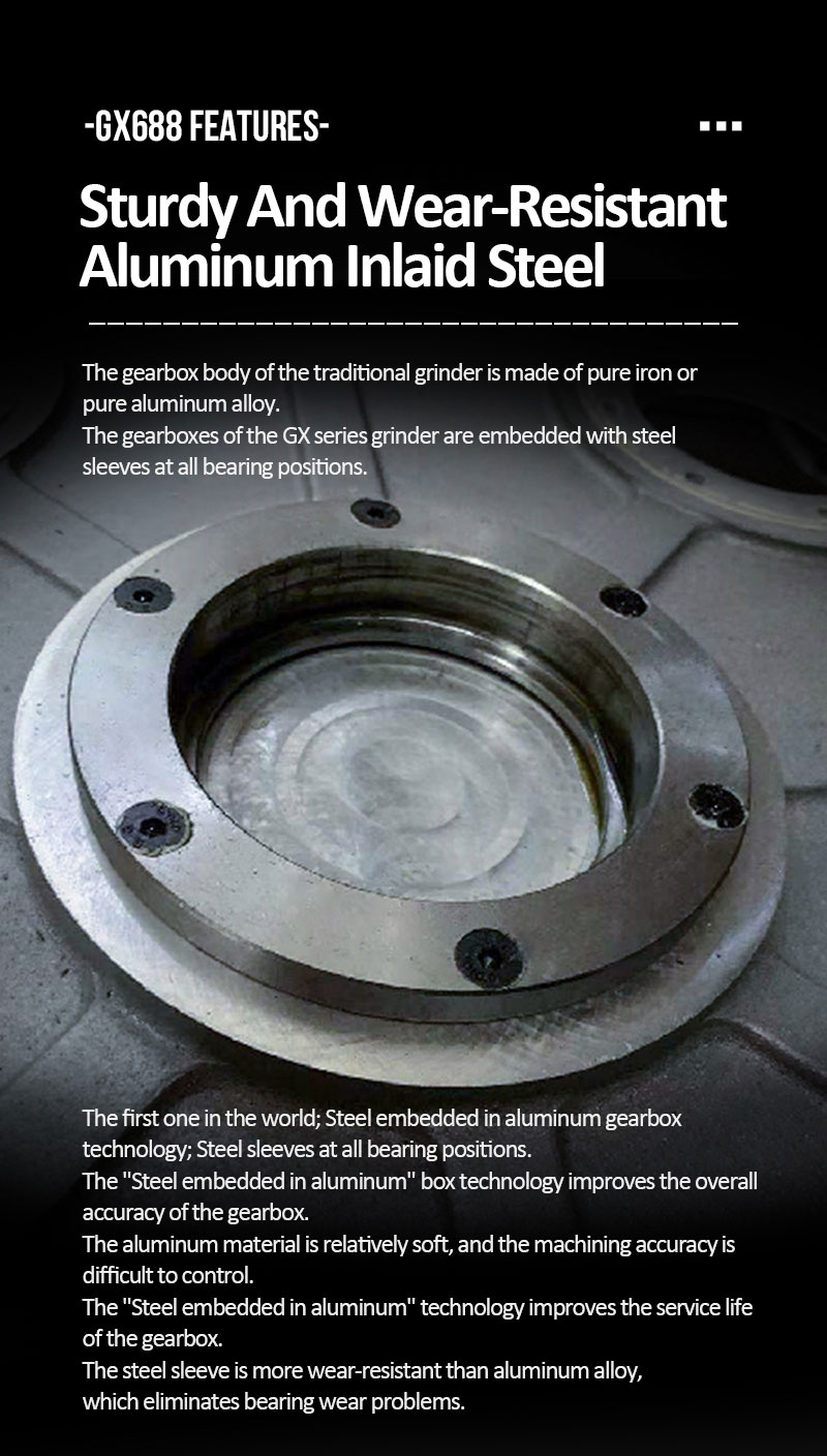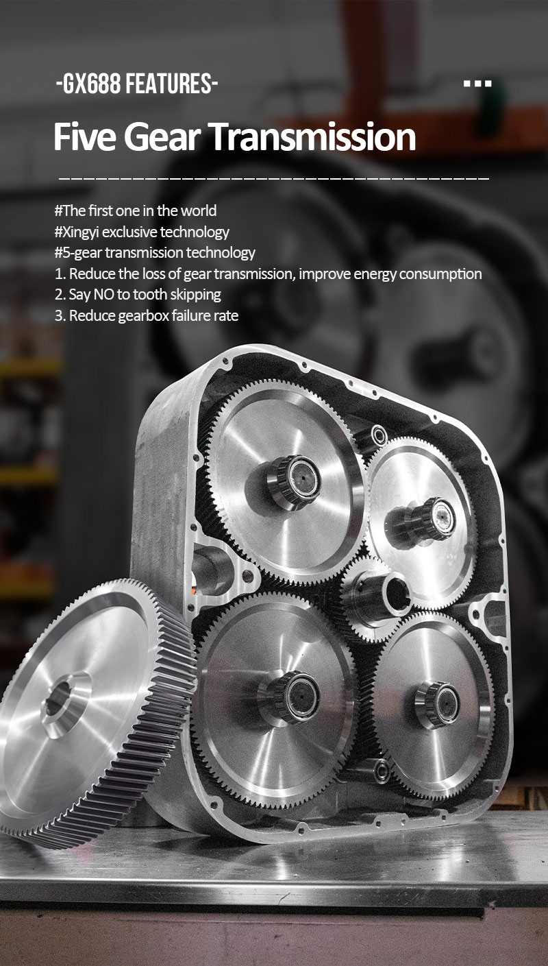 The unit weight of the gearbox is up to 310Kg, the first grinding pressure, 330Kg; the efficiency of the GX688 grinder is 20% higher than that of other 15KW grinder of XINGYI.